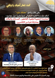 تنظم مؤسسة الفقيه التطواني ندوة علمية حول موضوع “المعارضة الشعبية الرقمية : الفاعلون المسارات و المآلات” وذلك مساء السبت 22 مارس الجاري بسلا ويأتي هذا النشاط تماشيا مع شعار المؤسسة “أحبك يا وطني” وفي سياق برنامجها ” مختلف عليه” .