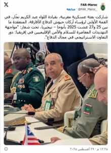 شارك وفد عسكري من المملكة المغربية رفيع المستوى، يقوده اللواء عبد الكريم نجار، في أشغال القمة الإفريقية الأولى لرؤساء أركان جيوش الدفاع، التي إحتضنتها العاصمة النيجيرية أبوجا من 25 إلى 27 غشت 2025، وذلك بتعليمات سامية من صاحب الجلالة الملك محمد السادس، القائد الأعلى ورئيس أركان الحرب العامة للقوات المسلحة الملكية.