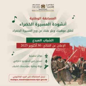 في إطار تخليد الذكرى الـ 50 للمسيرة الخضراء، أعلنت وزارة الشباب والثقافة والتواصل – قطاع الشباب – عن فتح باب المشاركة في المسابقة الوطنية “أنشودة المسيرة الخضراء”، وهي مبادرة فنية تروم الإحتفاء بهذا الحدث الوطني المجيد عبر الإبداع الموسيقي والشعري.