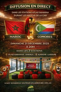 في خطوة مميزة، أعلنت محطات أطلس الصحراء عن بث مباريات كأس أمم إفريقيا 2025 (CAN) في محطاتها الواقعة في كل من العيون (محطة المطار) والداخلة (محطة وادي الذهب)، وذلك في أجواء إحتفالية حماسية تعكس عشق الجماهير المغربية لكرة القدم، وتحديداً لمساندة المنتخب الوطني المغربي في مسيرته بالبطولة القارية.